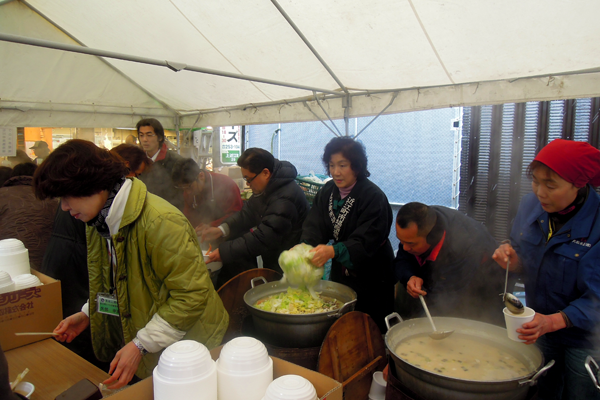 鍋大会では具沢山の「めった汁」、「かに汁」、「ぶりの粕汁」がふる舞われ、これを目当てにした多くの買い物客や観光客で会場は熱気むんむん。