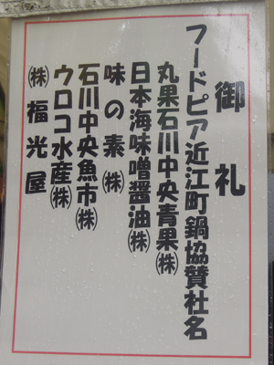 ちなみにフードピア近江町鍋大会の協賛各社は次のとおり、丸果石川中央青果㈱、日本海味噌醤油㈱、味の素㈱、石川中央魚市㈱、ウロコ水産㈱、㈱福光屋。